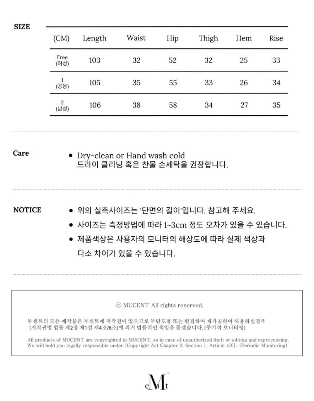 SIZE 1 男女共用 (總長105cm 橡筋腰圍 70~cm 臀寬 55cm)