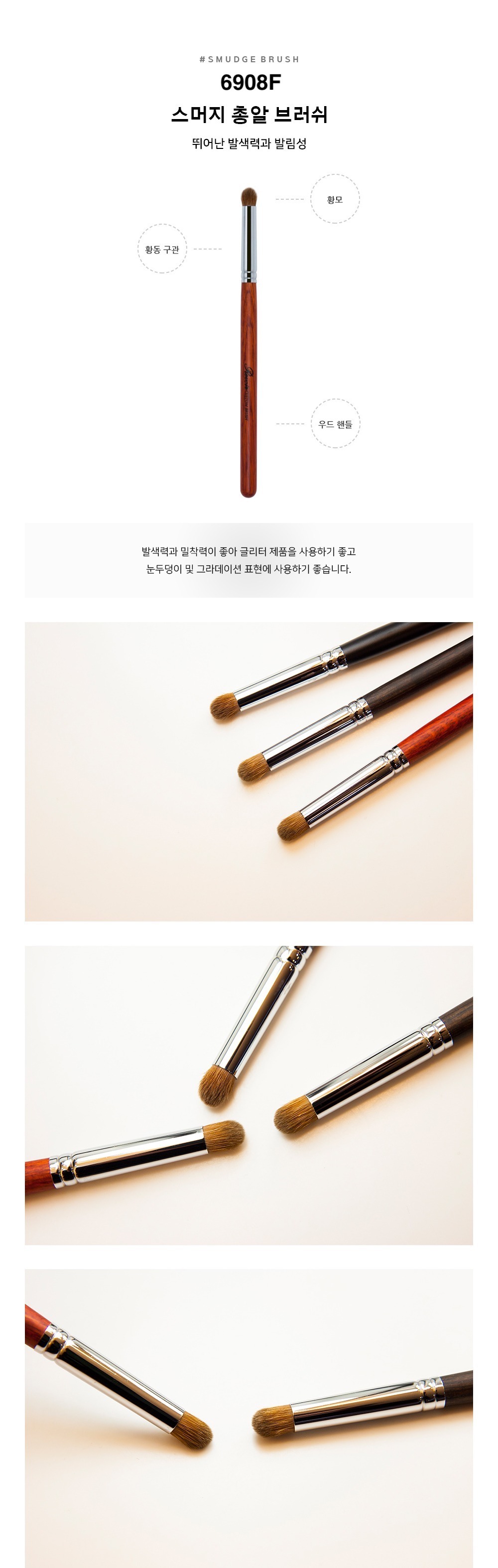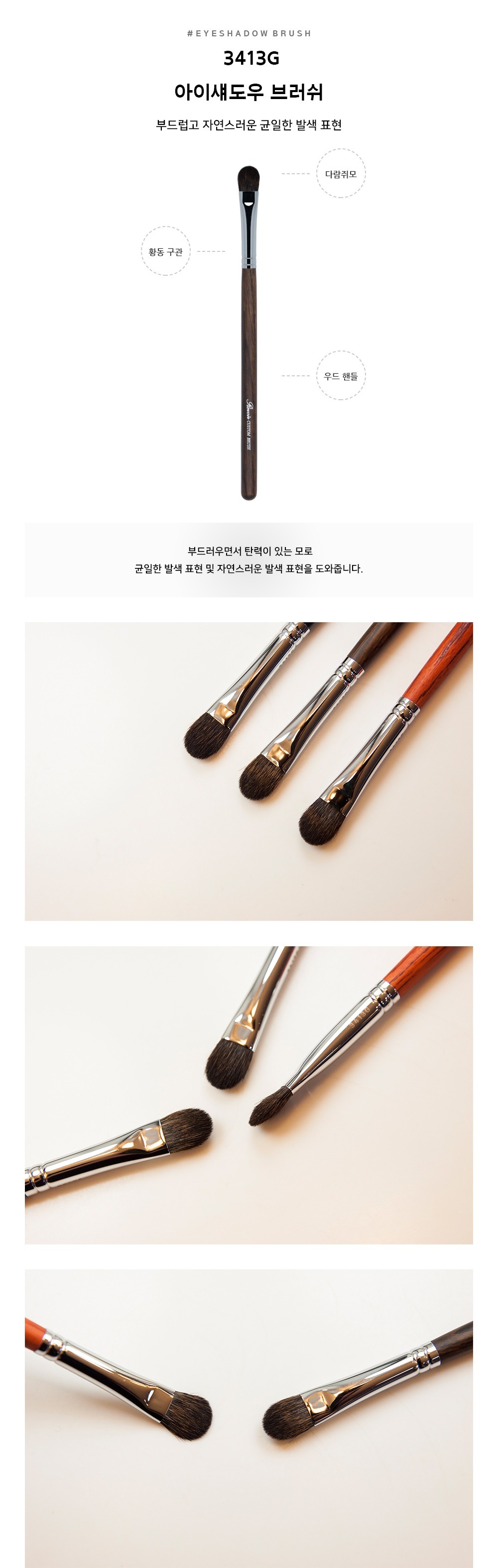 使用彈性良好的毛,塗抹性、持久力及顯色表現都很好,非常適合作為三角區、卧蠶等的點綴眼影使用。