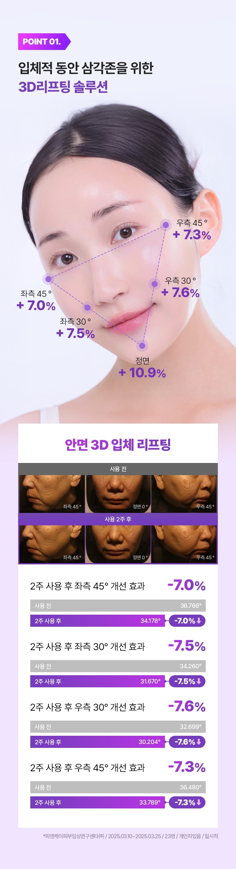使用2星期後,左右臉各角度平均有 約7%~10.9%改善效果