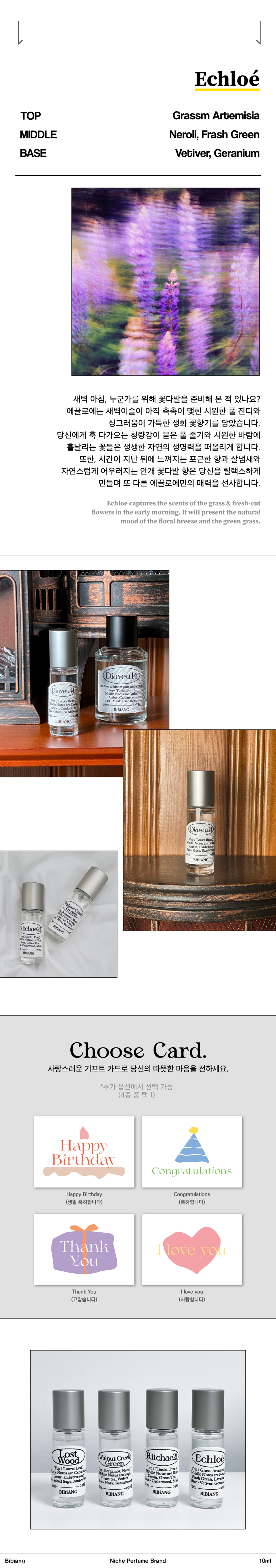 這款香水屬於草本綠香調(Herbal Green)。頂調中的青草與蒿草(Artemisia)帶來清新且略帶辛香的草本氣息,營造出自然、清爽的開端。中調中的橙花(Neroli)與新鮮綠葉香進一步增添了自然清新的綠意,讓整體香味變得更加輕盈和透亮。基調中的岩蘭草(Vetiver)與天竺葵(Geranium)提供了溫暖的木質和清新的花香,使尾韻帶有微微辛香和大地感。
