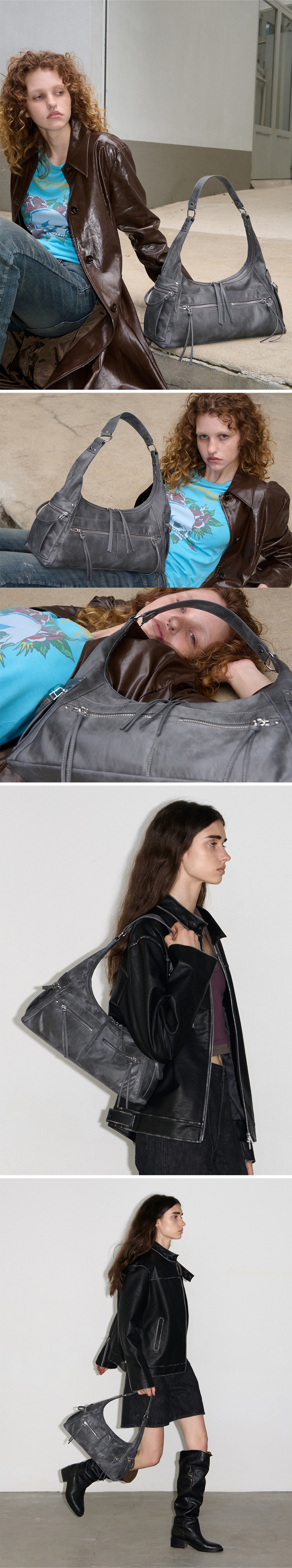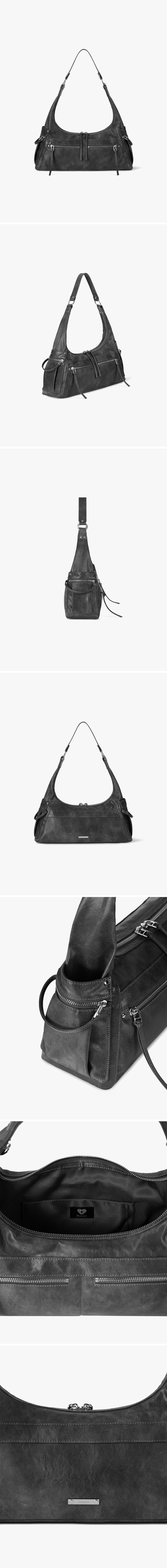 - 突顯4個拉鍊口袋細節的單肩流浪漢包