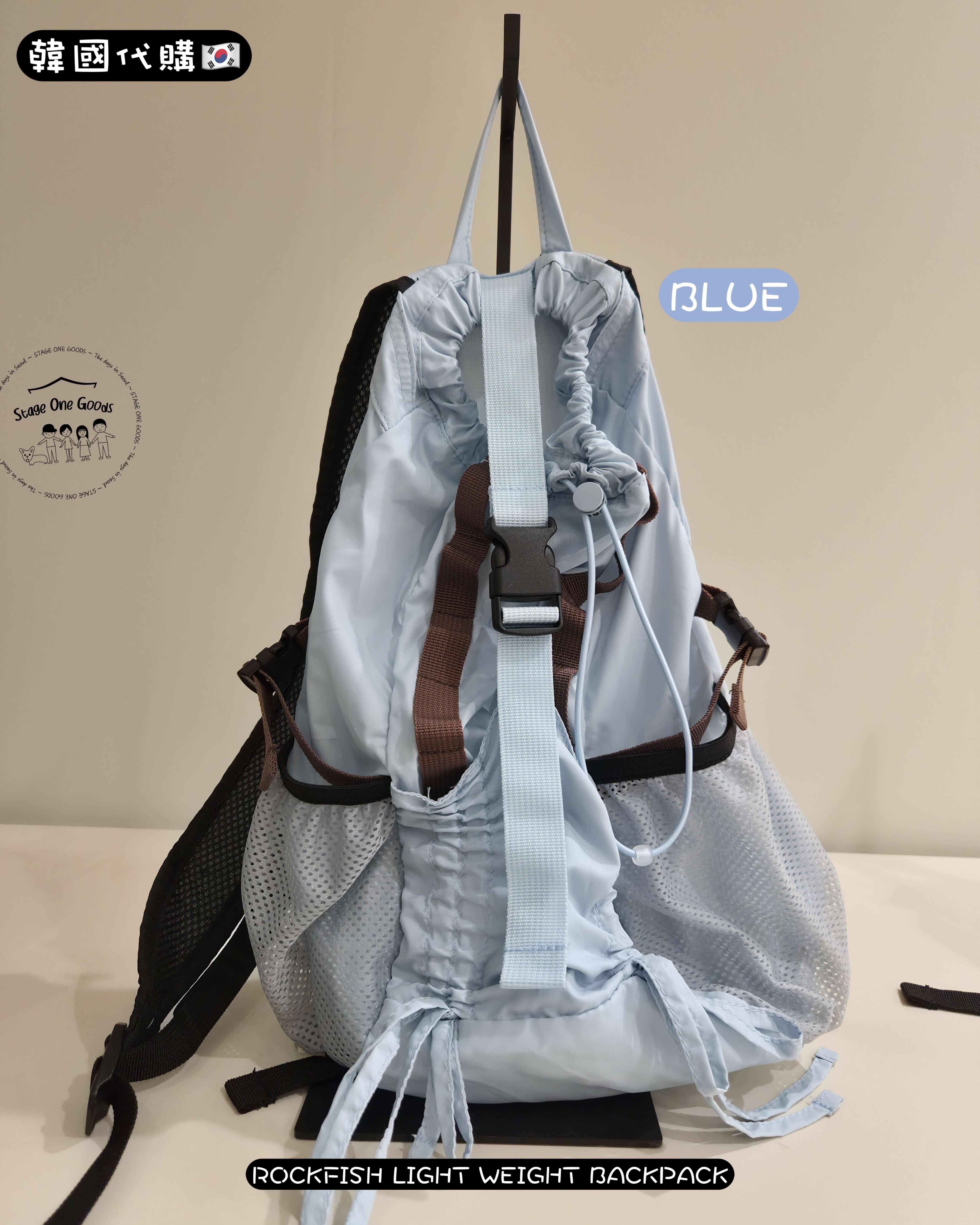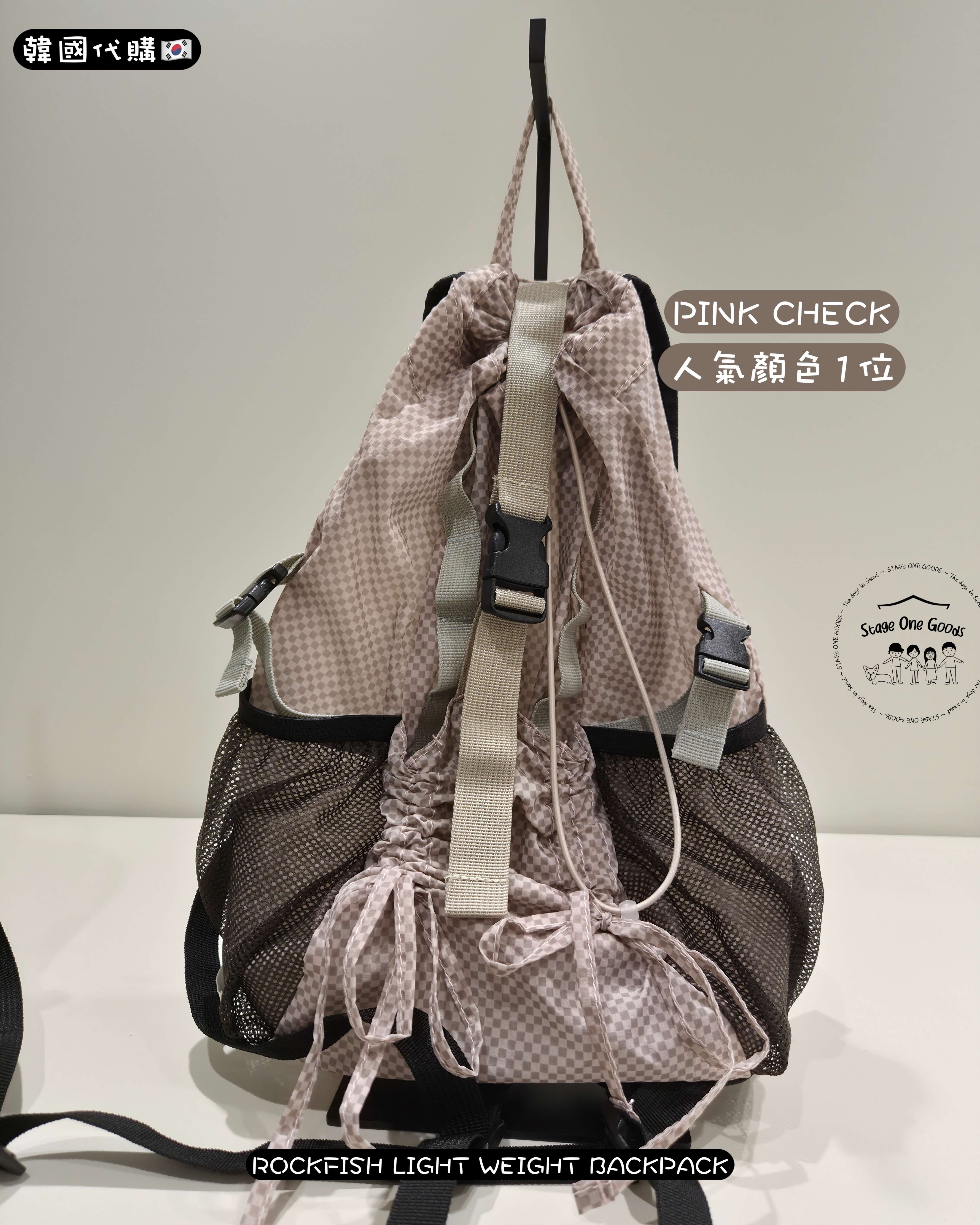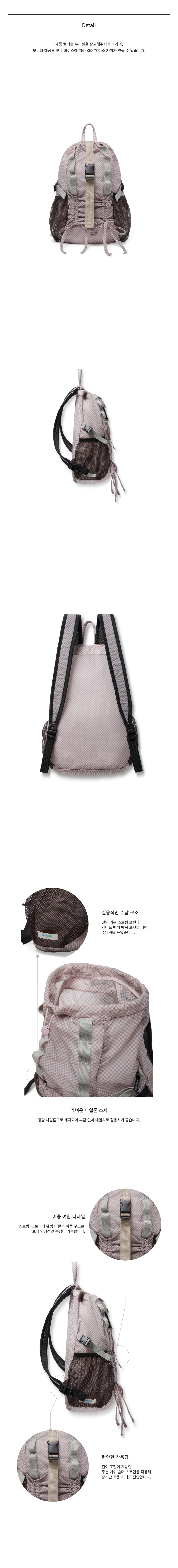 - 前方蝴蝶結抽繩口袋 & 側邊網布口袋